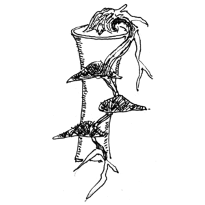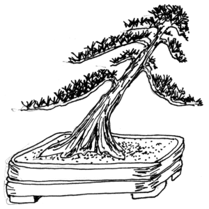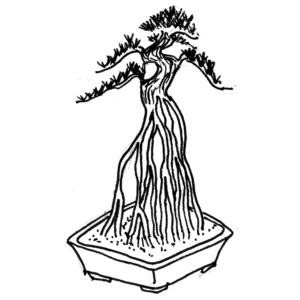 A cascade occurs because a lower branch grows particularly faster for its own reason, and then droops under its own weight…to become a cascade as shown in the sketch. A “semi-cascade” tree, if found on the side of a tall cliff, can result in a “full cascade.” This happens when the lower side branch keeps reaching out away from the cliff to seek light, while the top growth near the cliff dies off due to the lack of sunlight exposure. These bonsai are usually in a tall pot to enable the hanging branch to hang freely…and to complement a tall stand when being displayed.